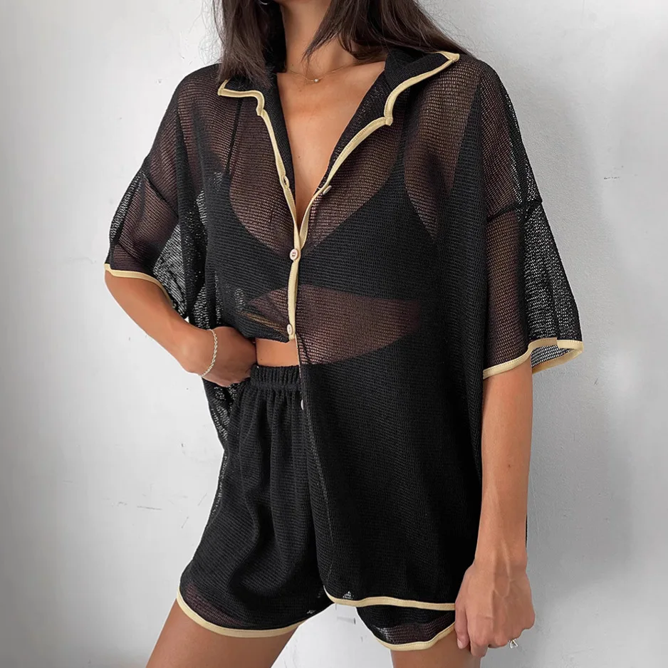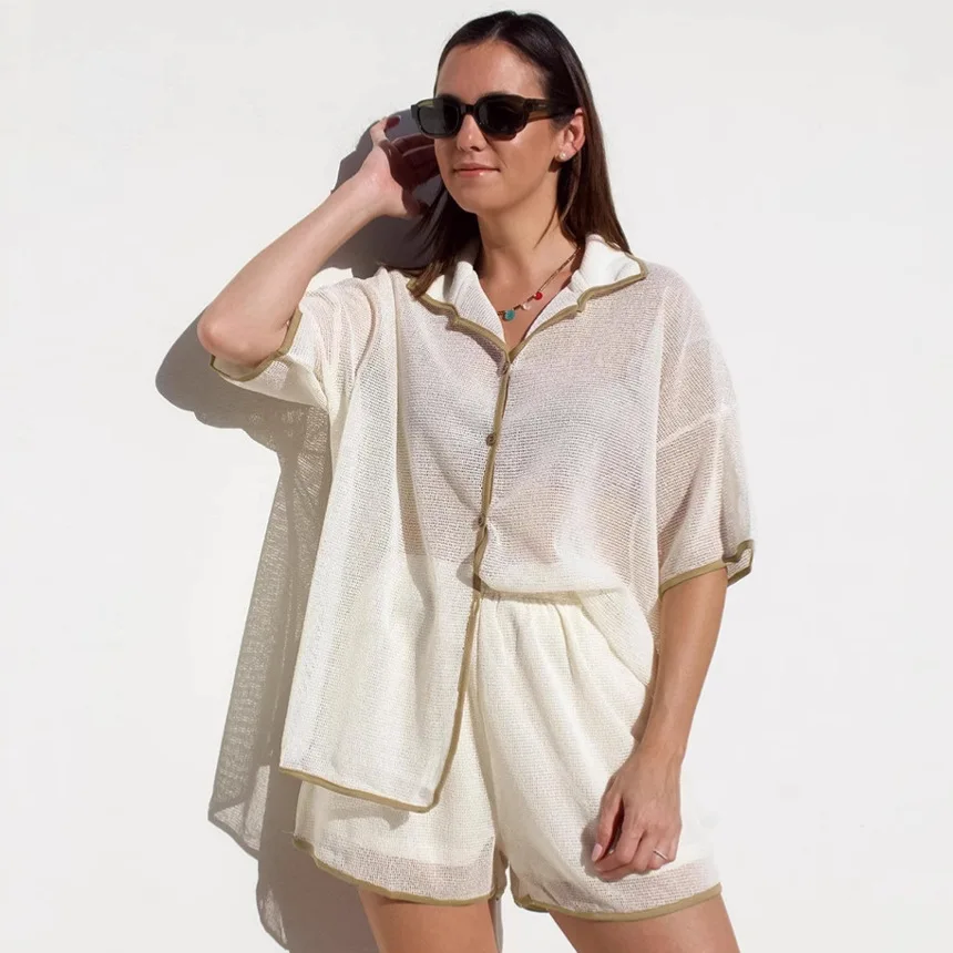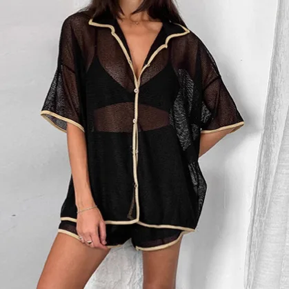 Summer Sexy See Through Holiday Two Piece Outfits Short Sleeve Top and Shorts Matching Set 2025 Women Mesh Beach Shorts Sets